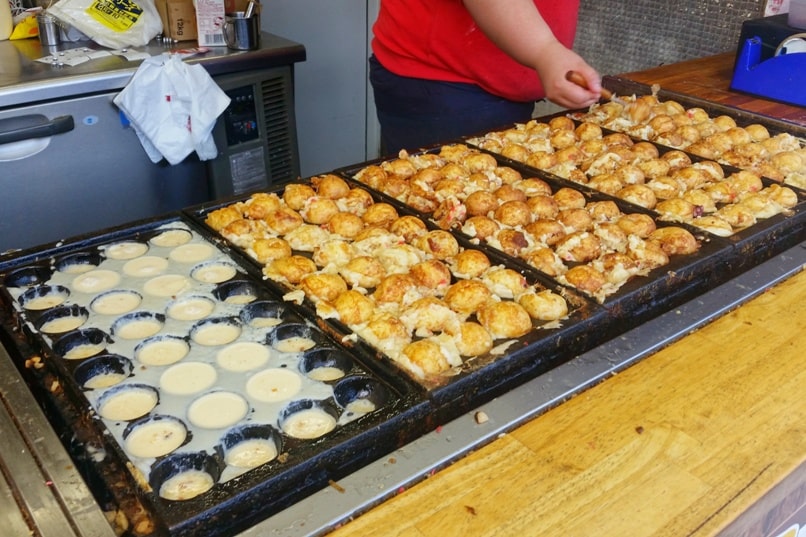 Lastly and most adventurous for me will be takoyaki. This street food is cooked on a special grill made of consecutive half cylinders in a row. The cook pours a batter into the grill and starts to add ingredients like onions and garlic but the main attraction is a chunk of octopus. After a minute or two, the cook skillfully uses chopsticks to turn the ball over to cook evenly. Then they present a portion of about 8 takoyaki topped with a mayonnaise sauce, bonito flakes, and seaweed powder. The outside is crispy leaving the inside batter uncooked but hot and gooey. With the chewy octopus in the middle, this treat will take a lot of courage for me to try.